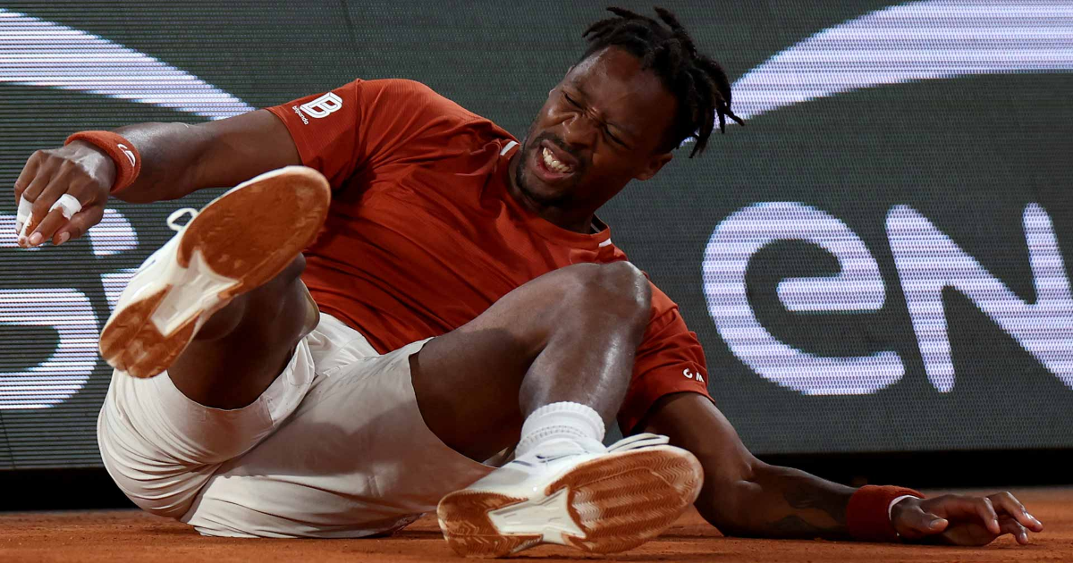 Roland GarrosFrenchman falls during fifth point of opening-round match & later completes two-sets-to-love comeback
