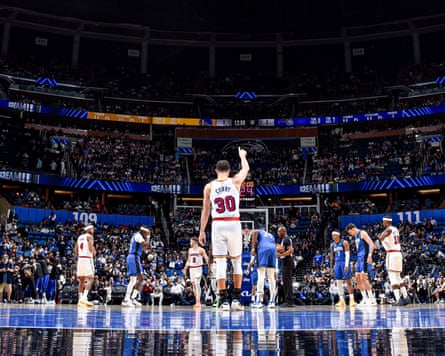 Stephen Curry hit 12 for 19 shots from three-point range on Thursday night, making 10 or more for the NBA-record 26th time in his career. Photograph: Fernando Medina/NBAE/Getty Images