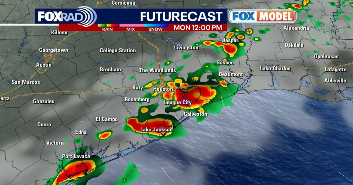 HARRIS COUNTY, Texas – Heavy rain is moving across the Houston area on Monday. The focus of the heavy rain will move from the Sugar Land – Houston – Humble area to the coastal counties by late morning and midday.