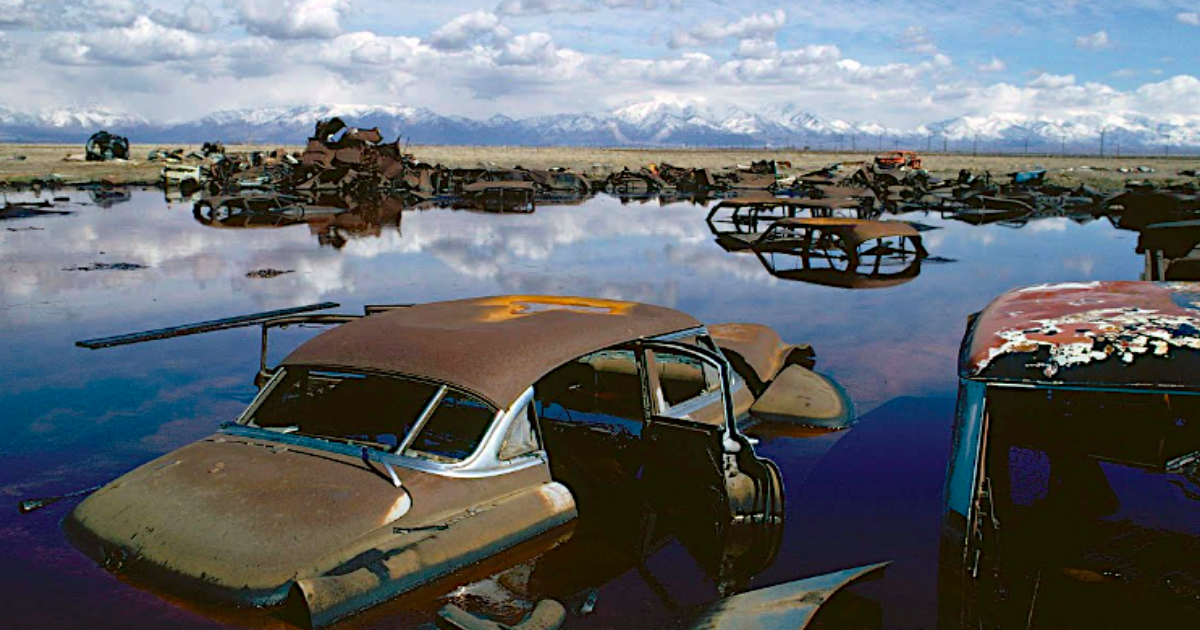 Abandoned automobiles and other debris clutter an acid water and oil filled five acre pond near Ogden, Utah, in April of 1974. It was cleaned up under EPA supervision to prevent possible contamination of Great Salt Lake and a wildlife refuge nearby. (Bruce McAllister / U.S. National Archives)