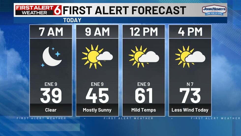 Expect highs in the low to mid 70s with less wind than yesterday.