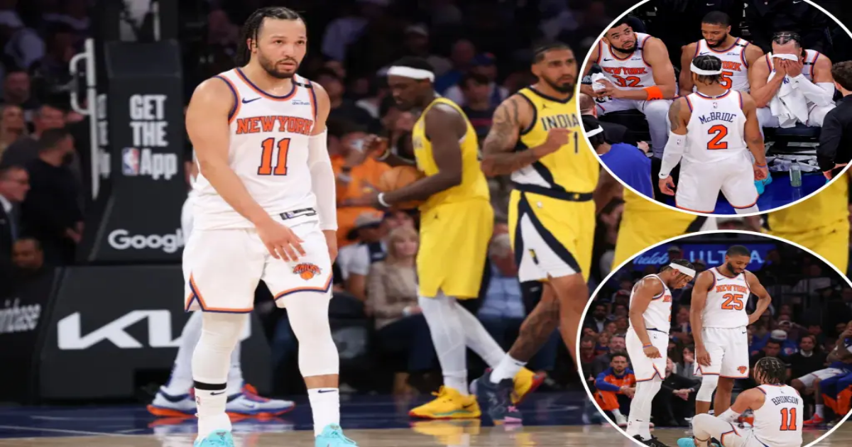 Jalen Brunson dejected in final seconds of Knicks’ loss to Pacers on May 23, 2025. Charles Wenzelberg / New York Post