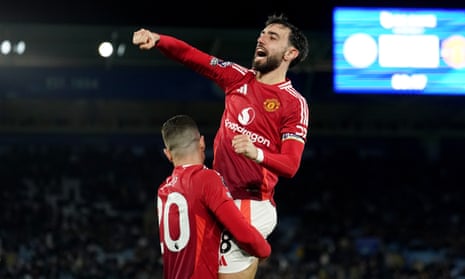 Manchester United’s Bruno Fernandes celebrates scoring their side’s third goal of the game. Photograph: Martin Rickett/PA