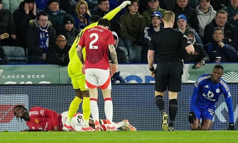 48 min Vardy sneaks into the area. He could shoot but chooses to square for Daka, who is squeezed out by Heaven – but in the process, United’s precocious teenager goes down in agony. A stretcher is going round to him, and you just hope it’s not as bad as it looks.