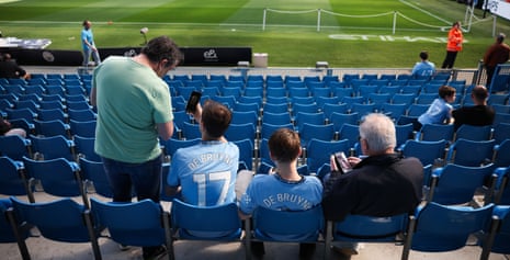 Manchester City fans take their seats on an extremely pleasant spring afternoon in Manchester. Photograph: Adam Vaughan/EPA