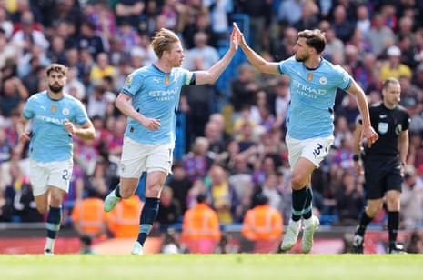 Kevin De Bruyne get a high five from Ruben Dias. Photograph: Martin Rickett/PA
