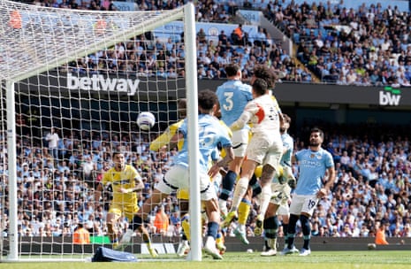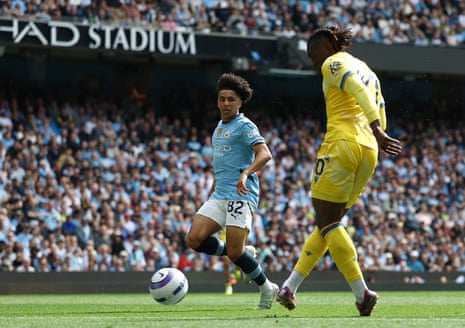 28 min: Eberechi Eze curls a low shot past Ederson from about 15 yards after receiving the ball from Sarr but semi-automated offside technology rides to the home side’s rescue. It’s a shame, as Eze had no reason to be offside. City are being eviscerated down both flanks, particularly the right.