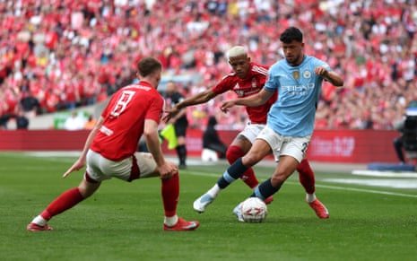 Matheus Nunes of Manchester City battles for possession with Elliot Anderson and Danilo of Nottingham Forest. Photograph: Matt Lewis/The FA/Getty Images