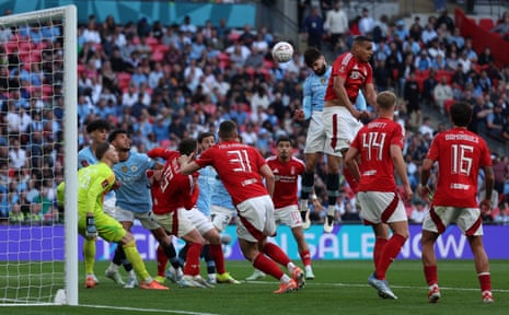 Manchester City’s Croatian defender Josko Gvardiol headers the ball to scores the team’s second goal. Photograph: Adrian Dennis/AFP/Getty Images