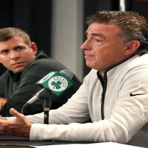 Boston, MA – September 23: Boston Celtics owner Wyc Grousbeck, right, and president of basketball … More operations Brad Stevens spoke at a press conference to address the suspension of…