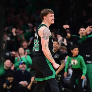 Celtics Boston Celtics’ Baylor Scheierman reacts after making a 3-pointer during second half of an NBA basketball game against the Brooklyn Nets Tuesday, March 18, 2025, in Boston. (AP Photo/Michael…