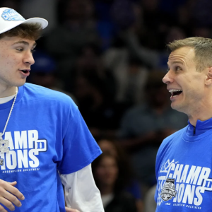 Mar 15, 2025; Charlotte, NC, USA; Duke Blue Devils forward Cooper Flagg (2) and head coach Jon Scheyer celebrate after winning the 2025 ACC Conference Championship game against the Louisville…