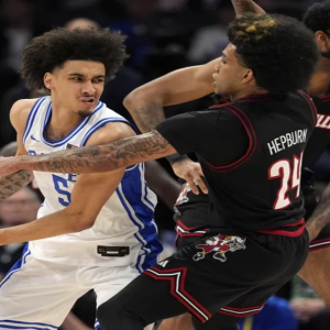 Mar 15, 2025; Charlotte, NC, USA; Duke Blue Devils guard Tyrese Proctor (5) looks to pass against Louisville Cardinals guard Chucky Hepburn (24) in the first half of the 2025…