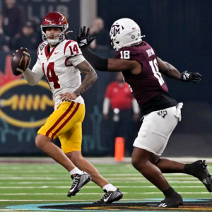 USC quarterback Jayden Maiava looks to pass under pressure from Texas A&M defensive lineman Cashius Howell during the first half of the Trojans’ 35-31 comeback win in the Las Vegas…