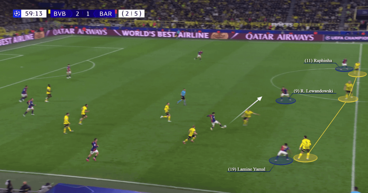De Jong goes back to Cubarsi, who finds Martin. That prompts Dortmund wing-back Yan Couto to push up, leaving Raphinha in space. Flick points and Martin passes to the Brazilian, whose switch to Lamine Yamal is too heavy.