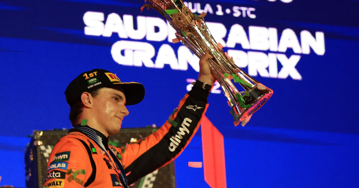 Item 1 of 9 Formula One F1 – Saudi Arabian Grand Prix – Jeddah Corniche Circuit, Jeddah, Saudi Arabia – April 20, 2025 McLaren’s Oscar Piastri celebrates with the trophy on the podium after winning the Saudi Arabian Grand Prix REUTERS/Thaier Al-Sudani