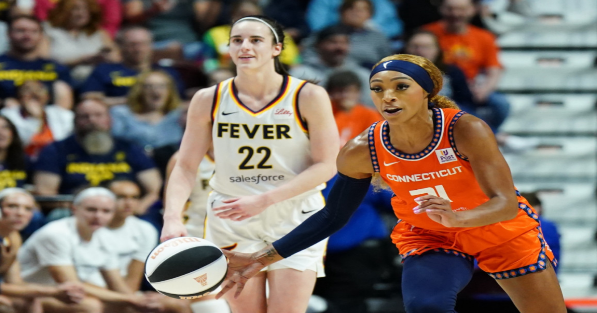Connecticut Sun guard DiJonai Carrington and Indiana Fever guard Caitlin ClarkDavid Butler II-USA TODAY Sports