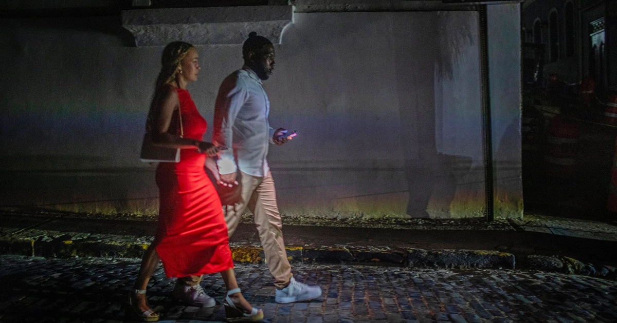 A tourist couple use their cellphones for light on a street in Old San Juan during a massive power blackout Wednesday night. Jose Jimenez / Getty Images