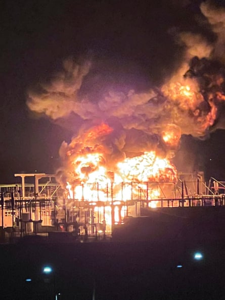 The blaze at the North Hyde electrical substation near Heathrow airport early on Friday. Photograph: Matthew Muirhead/AP