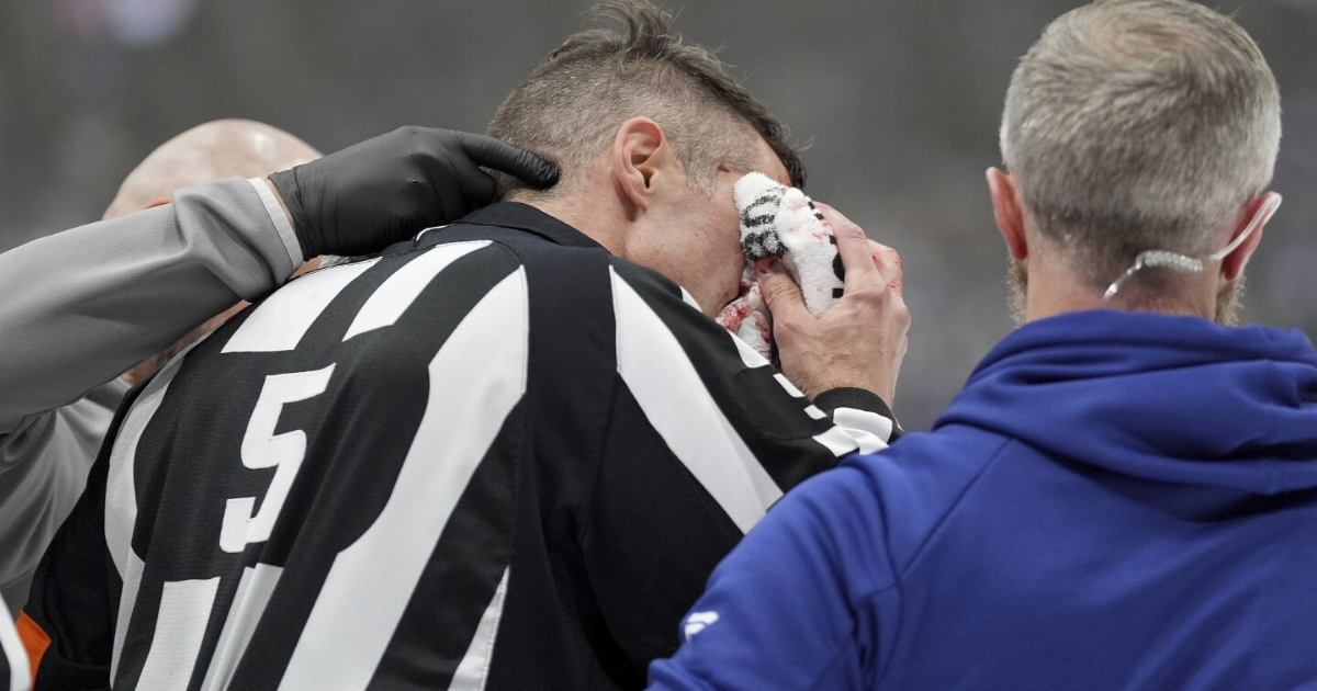 TORONTO (AP) — Referee Chris Rooney, widely considered to be one of the top officials in the NHL, was bloodied and had to leave Game 7 of the Florida-Toronto playoff matchup Sunday night after taking an inadvertent stick above one of his eyes.