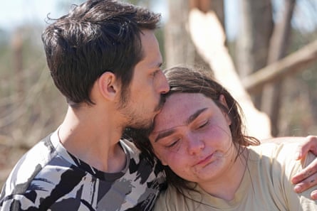 Steve Romero, comforts his fiancee, Hailey Hart, on Sunday, after the couple and their dogs rode out a tornado in their car on Saturday in Tylertown, Mississippi. Photograph: Rogelio V Solis/AP