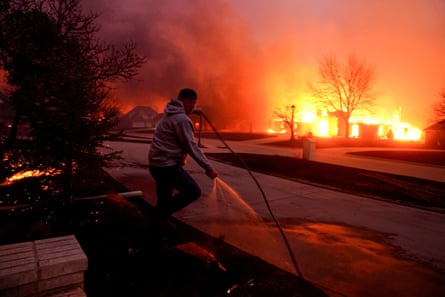 Cody McIntire sprays water on a fire burning in a yard in front of his friend’s house during a wildfire outbreak in Stillwater, Oklahoma, on Friday. Photograph: Nick Oxford/Reuters