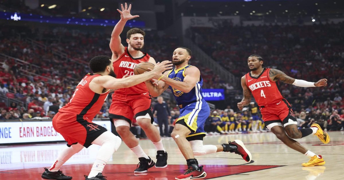 (Photo of the Rockets’ Fred VanVleet, Alperen Şengün and Jalen Green and the Warriors’ Steph Curry: Troy Taormina/ Imagn Images)
