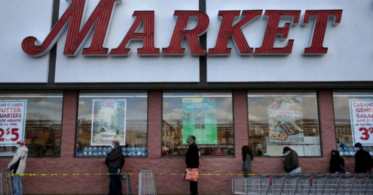 Shoppers wait in line outside a Market Basket in Somerville, MA on December 26, 2020. (Craig F. Walker/Globe Staff)