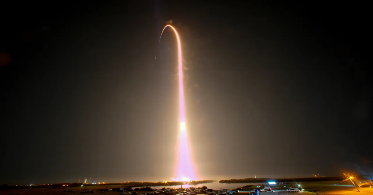 A SpaceX Falcon 9 rocket and Dragon capsule with a crew of four on a mission to the International Space Station is seen during a time exposure as it lifts off from pad 39A at the Kennedy Space Center in Cape Canaveral, Fla., Sunday, March 3, 2024. (AP Photo/John Raoux)
