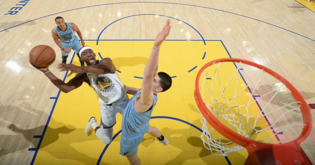 Golden State Warriors forward Jimmy Butler III drives to the basket against the Memphis Grizzlies in San Francisco on Tuesday. – Noah Graham/NBAE/Getty Images