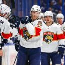 The Panthers took a 1-0 series lead by scoring six times on 16 shots against Lightning goalie Andrei Vasilevskiy. After Sam Bennett and Jake Guentzel traded goals in the first period, the Panthers scored four straight times — including goals by Nate Schmidt and Matthew Tkachuk that were 14 seconds apart in the second period. Schmidt’s goal was unsuccessfully challenged for goalie interference by the Lightning, earning a delay of game penalty. Tkachuk scored on the ensuing power play to make it 4-1.