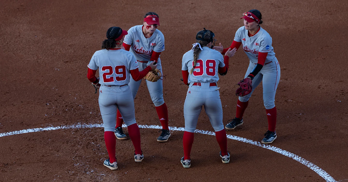 From left Tennessee catcher Sophia Nugent (7), Tennessee utility player Ella Dodge (25), Tennessee outfielder Taylor Pannell (3), and Tennessee pitcher Karlyn Pickens (23) celebrate after winning an NCAA super regional game between Tennessee and Nebraska at Sherri Parker Lee Stadium in Knoxville, Tenn., on May 24, 2025. Tennessee defeated Nebraska. / Caitie McMekin/News Sentinel / USA TODAY NETWORK via Imagn Images