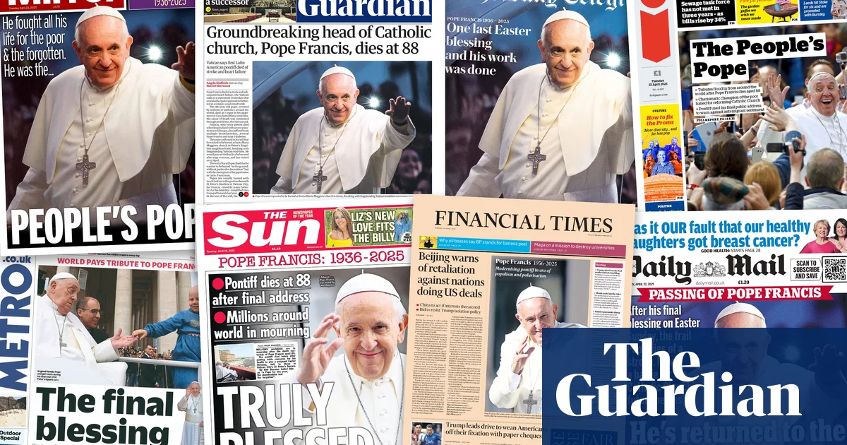 “Groundbreaking head of Catholic church, Pope Francis, dies at 88”, says the Guardian, featuring a picture of the late pontiff in a white soutane with his arm outstretched to the crowd.