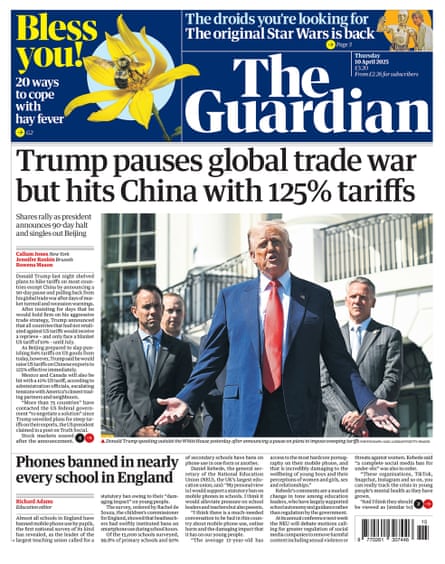 Trump’s 90-day pause on tariffs dominate the front pages today. The Guardian splashes on “Trump pauses global trade war but hits China with 125% tariffs”, the Times leads with “Trump puts the brakes on tariffs for 90 days” and the Daily Telegraph has “Trump blinks first in trade war”. The FT is going with “Stocks soar as Trump presses tariffs pause button and hits China harder”, the Mail leads with “Trump blinks … but doubles down on China” and the Metro has “Trump risks the great maul of China”. In the Mirror, it’s “Great War of China”.