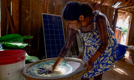 A person preparing cassava in the traditional way beside a solar panel Photograph: Pablo Porciúncula/AFP/Getty Images