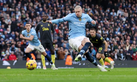 78 min: Chance for City! Savinho slips Branthwaite on the right edge of the area and curls a fine cross towards the backpedalling Haaland at the far post. He could go for goal but tries to give Bernardo Silva an easier chance with a header back across the face. There’s slightly too much on it and Everton are able to clear.
