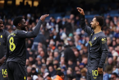 Everton’s Iliman Ndiaye (right) celebrates scoring twith Orel Mangala. Photograph: Phil Noble/Reuters
