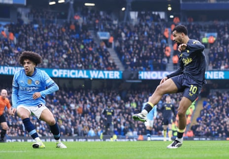 This is getting weirder and weirder. Manchester City’s run of form in all competitions now reads P13 W1 D3 L9 F15 A28. After first-half goals from Bernardo Silva and Iliman Ndiaye, Jordan Pickford save Erling Haaland’s penalty shortly after half-time. City had chances but Everton could also have nicked it on the break.