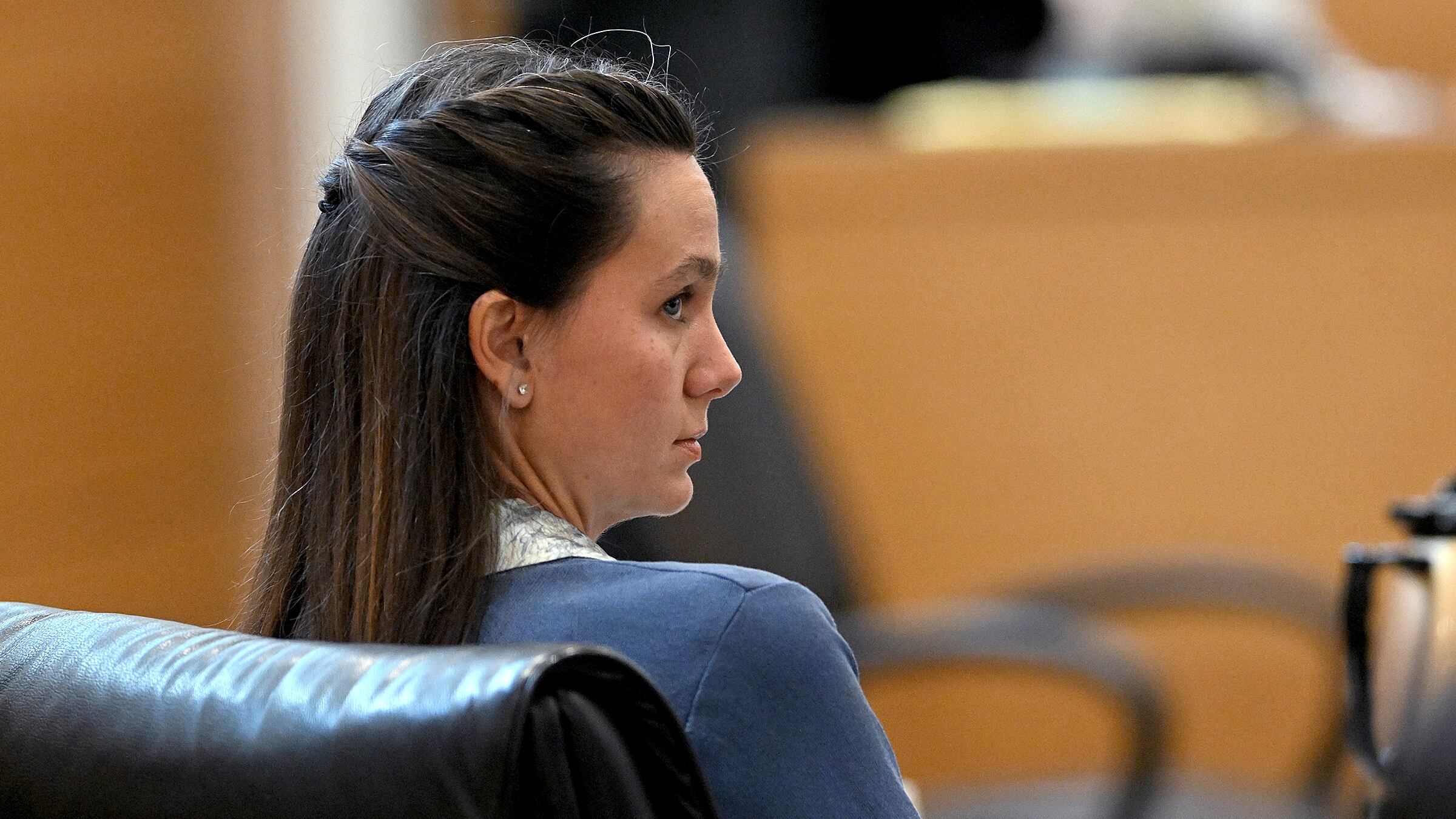 Defendant Ashley Benefield glances back after the jury retired to deliberate during her trial, Monday, July 29, 2024, at the Manatee County Judicial Center in Bradenton, Fla. Benefield is on trial for the 2020 shooting death of her husband. Tiffany Tompkins/The Bradenton Herald via AP
