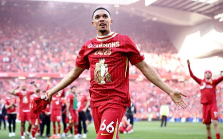 Trent Alexander-Arnold celebrates in front of fans after Liverpool’s victory and title win. Photograph: Adam Vaughan/EPA