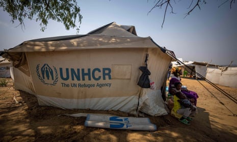 Refugee women sit in front of a UNHCR tent in the Gorom refugee settlement in South Sudan. Photograph: Dpa Picture Alliance/Alamy