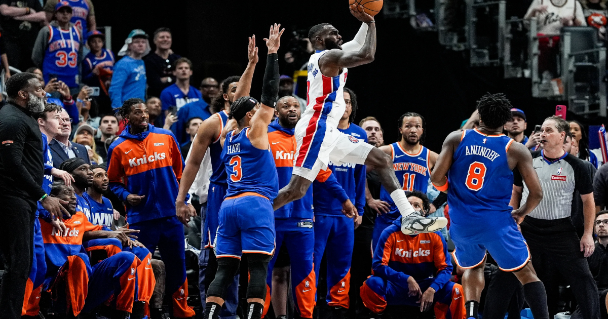Pistons coach J.B. Bickerstaff, players and fans went berserk at the lack of no foul being called against the Knicks on the play as NYK celebrated around Jalen Brunson (32 points, 15 in the fourth).