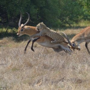 En la vasta sabana, se desarrolló una apasionante escena de vida silvestre cuando un leopardo gigante se posó sobre una elegante gacela. La gacela, ajena al imprudente ataque, pastó pacíficamente,…