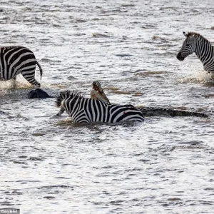 ¡El valiente enfrentamiento entre el cocodrilo y la cebra! La cebra se enfurece y rápidamente corre para atrapar la boca del cocodrilo con sus afilados dientes como navajas, buscando escapar. Sumérgete en esta emocionante escena de supervivencia y descubre la tenacidad de la cebra mientras lucha por su vida. Prepárate para presenciar una impresionante batalla en la naturaleza, donde la astucia y la determinación se enfrentan en una lucha por la supervivencia.