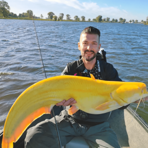 Hombre aturdido en los Países Bajos después de capturar un bagre enorme y excepcionalmente raro de color plátano Un bagre típico es gris o marrón. Uno en un millón, un individuo…