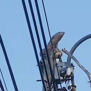 “A giant lizard climbs a power pole to escape from a pack of dogs chasing it. This incredible sight was captured on camera and has gone viral on social media….