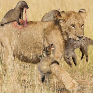 Amargo final para la mangosta tras atacar frenéticamente a la manada de leones