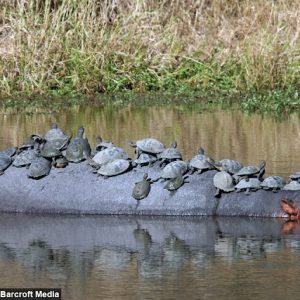 Impresionante imagen de más de 30 tortugas trepando por la espalda del hipopótamo mientras se sumerge en el río. – nature