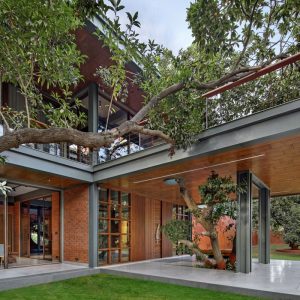 In the outskirts of Bharuch, Gujarat, the dense 50 year old Sapota plantations held both the main attraction and the biggest challenge in the design of this weekend house for…