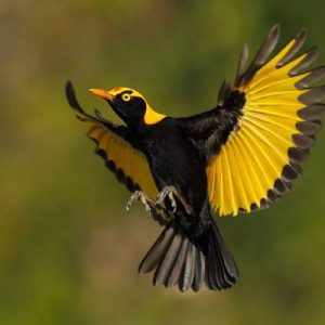 Witness the enthralling elegance of the Regent Bowerbird, a masterpiece of gold, orange, and jet black plumage